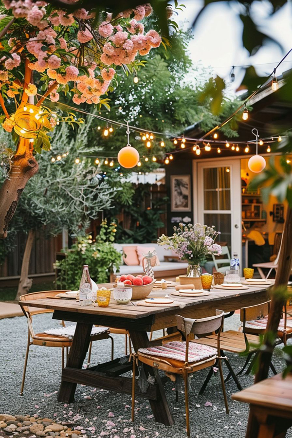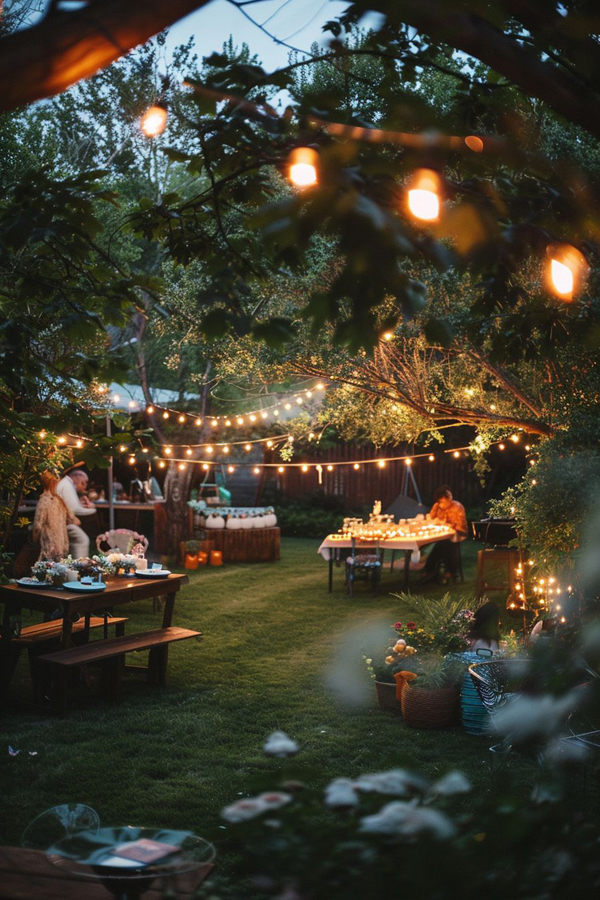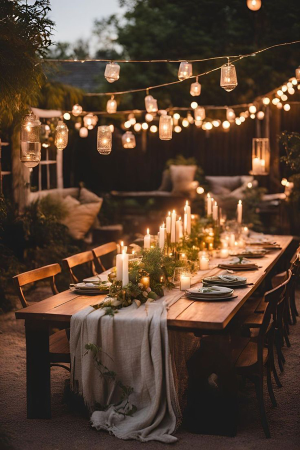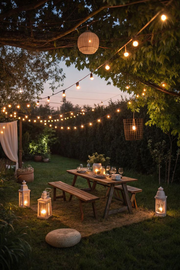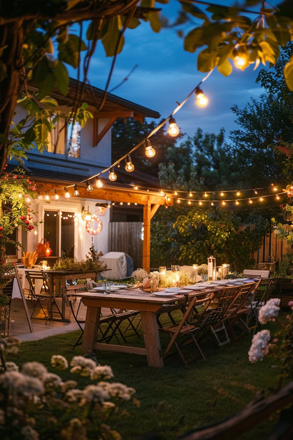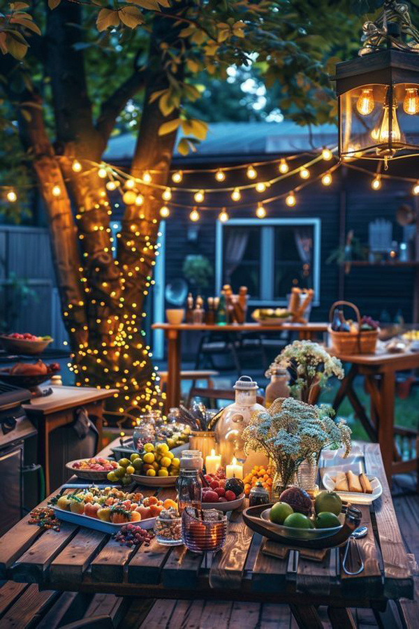 To make your New Year’s party decorations even more vibrant, combine string lights with other decorative elements. Use wooden tables, lounge chairs, or bean bags to create a cozy gathering area. Add candles, lanterns, or small LED lights as additional lighting accents. Decorative plants and fresh flowers can also enhance the outdoor atmosphere. Combining string lights with natural elements will create a warm and classy New Year’s party decoration.