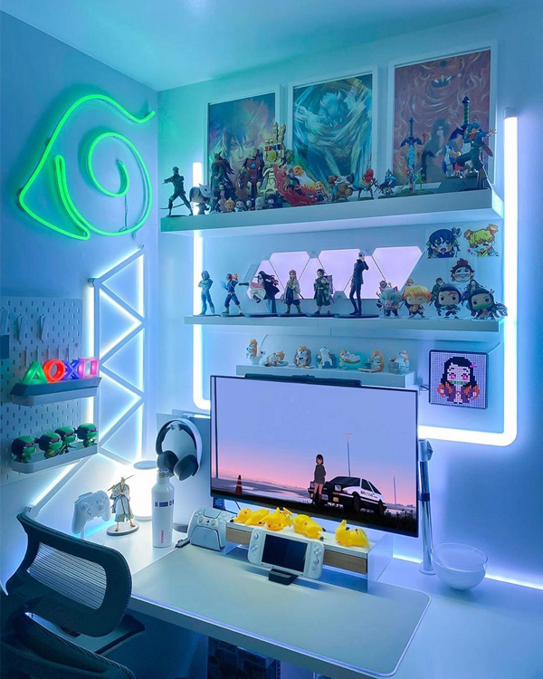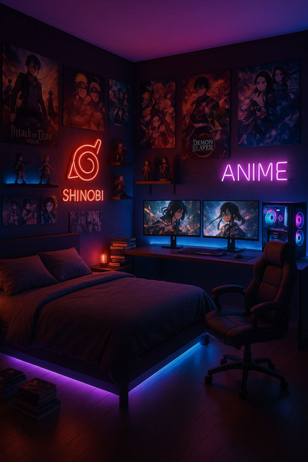 LED strip lights can create a dramatic effect, reminiscent of anime. You can install them behind a desk, bed, or along a wall. Use colors like blue, purple, or RGB to create a more lively atmosphere in your room, especially at night.