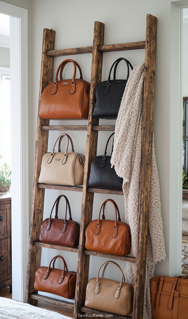 A short, unused wooden ladder can be transformed into a rustic-style bag rack. You can lean the ladder against a wall or hang it horizontally. Each rung can serve as a place to hang bags or store small baskets filled with pouches. This is a great option for those who prefer an artistic, yet relaxed, home look.