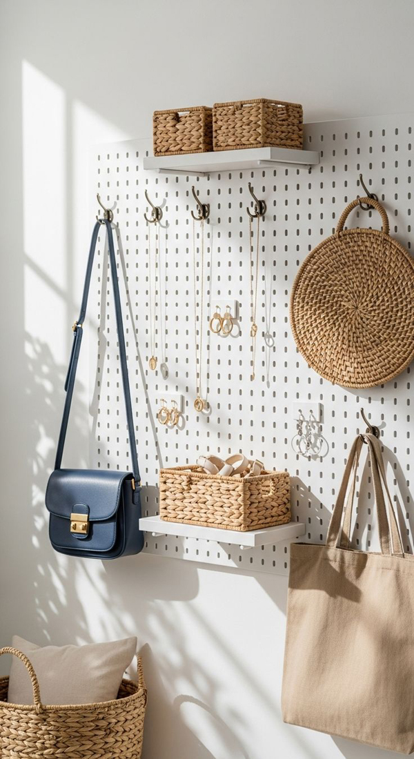 Using a pegboard allows you to flexibly organize your storage layout. Simply mount the board on your bedroom wall and use wooden or metal pegs to hang your bags. The advantage is that you can adjust the spacing between your bags according to their size—from small clutches to large totes—while also making your collection a focal point in your room.