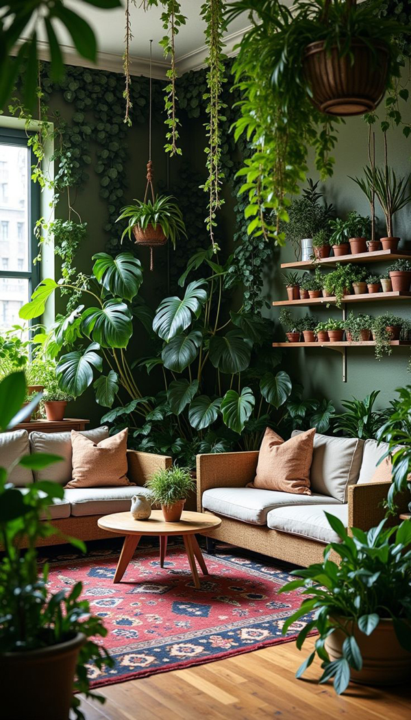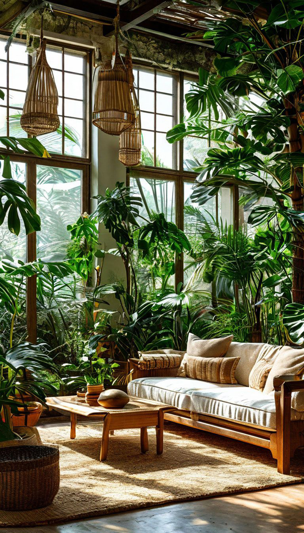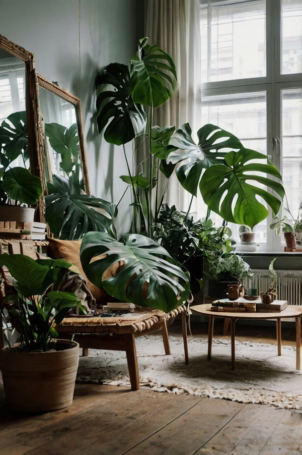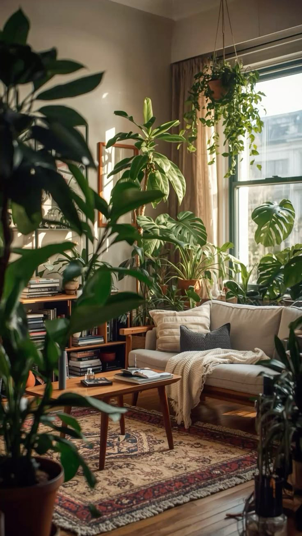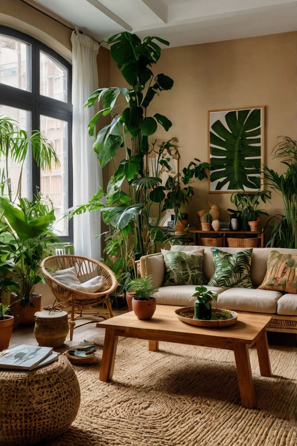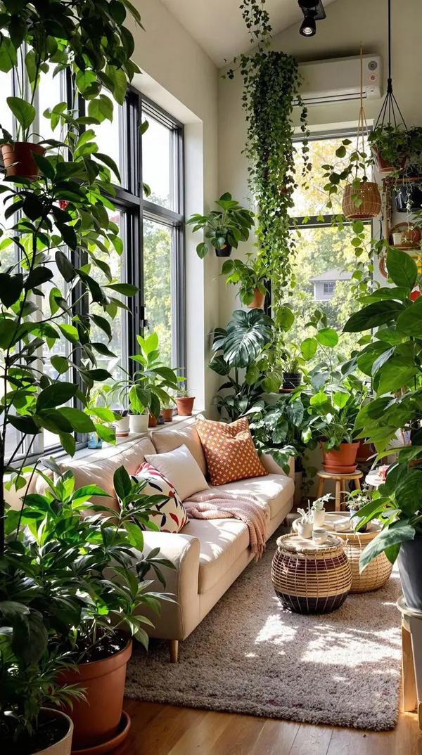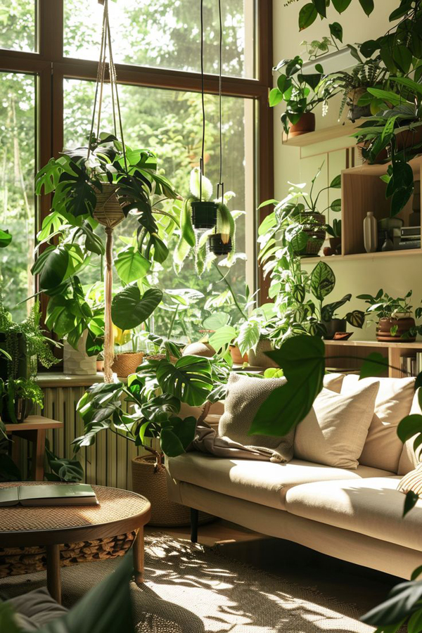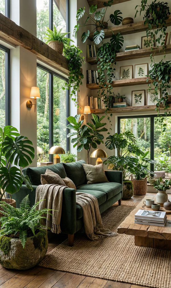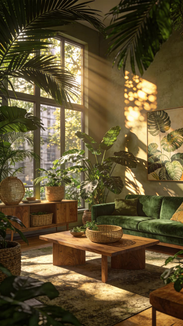 Plants are key to creating a jungle atmosphere in your living room. Choose plants like monstera, palm trees, or philodendrons, which have large, lush leaves. You can place them in corners, hang them from the ceiling, or use plant stands to create a “mini-forest” effect inside your home.